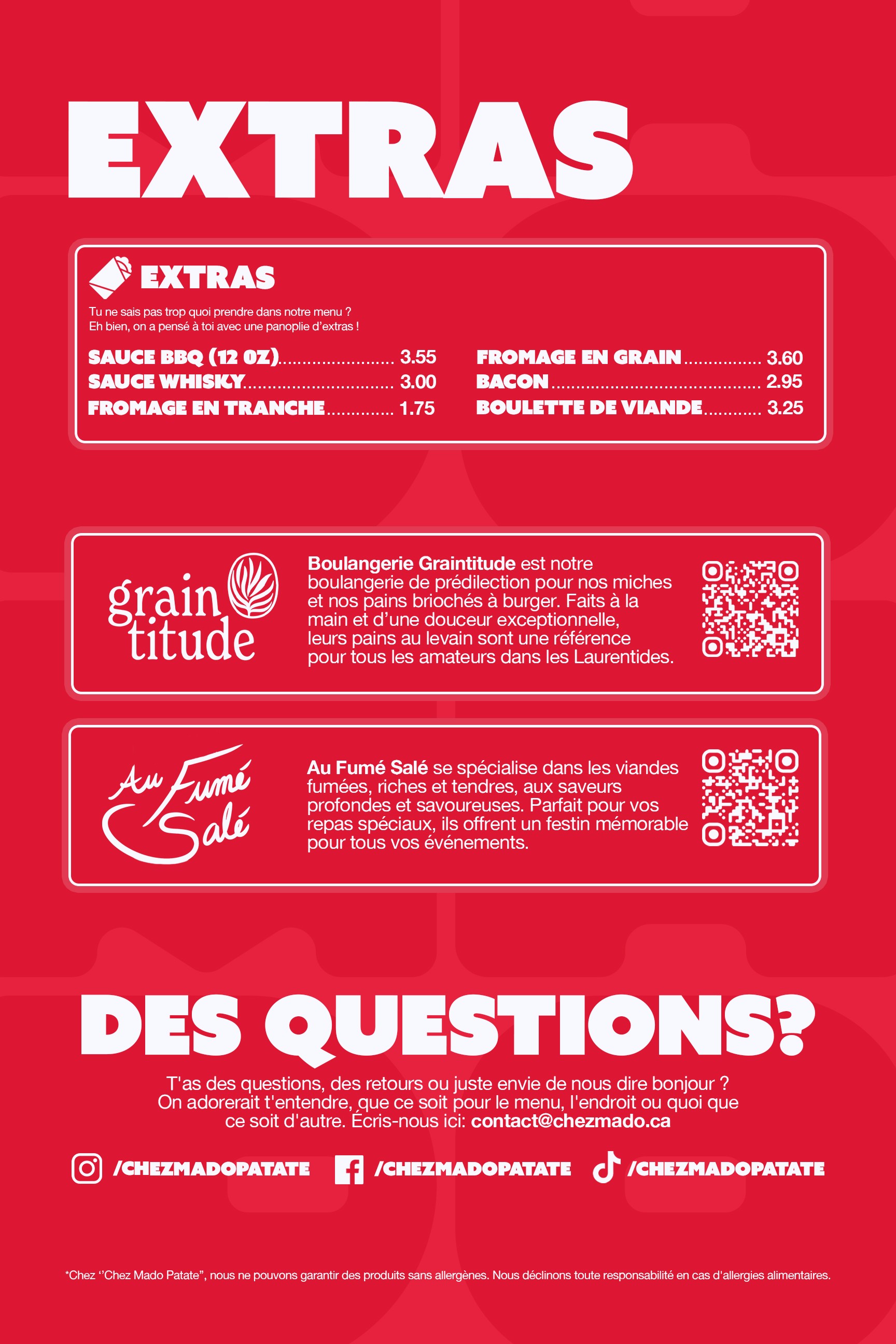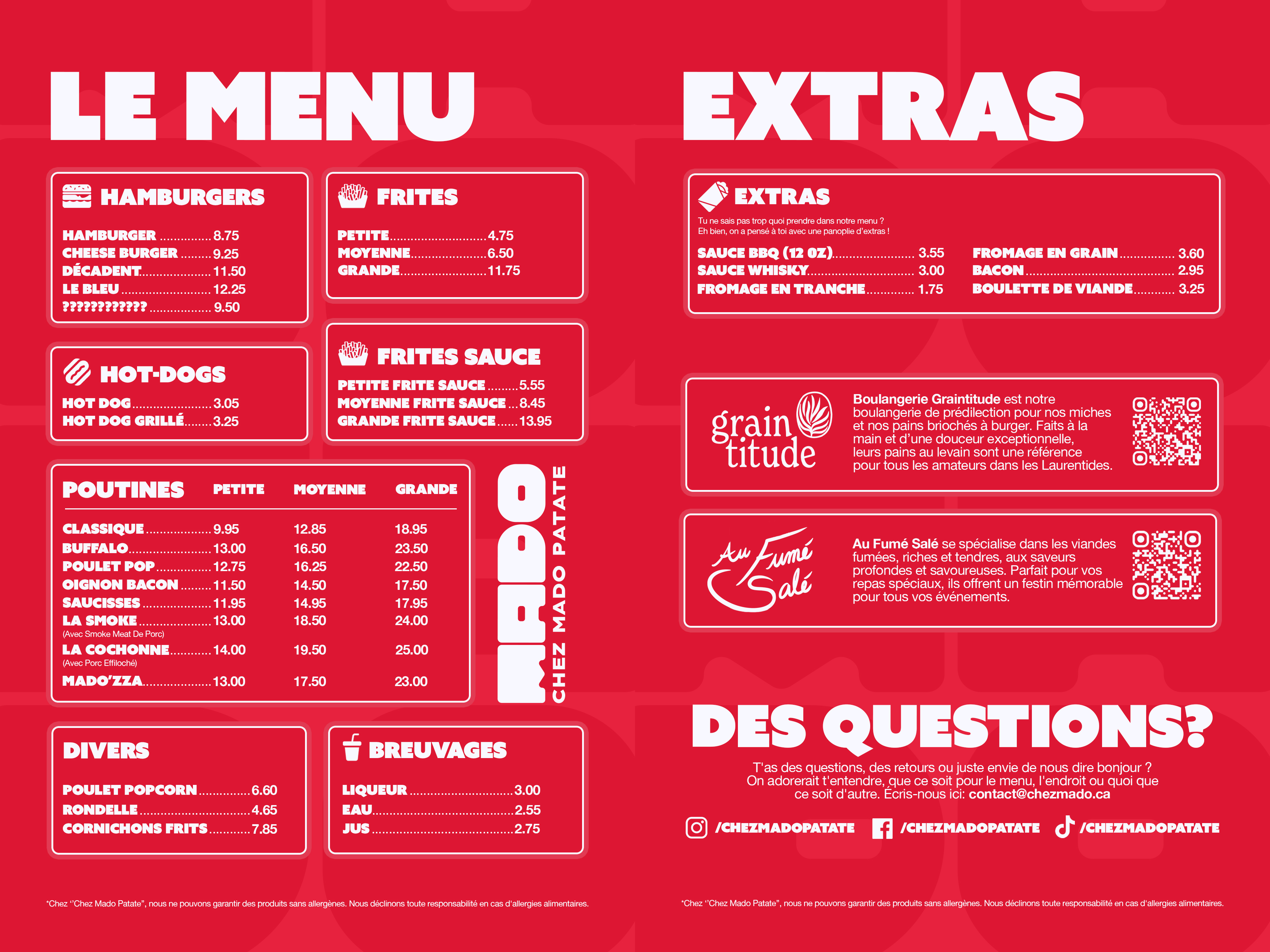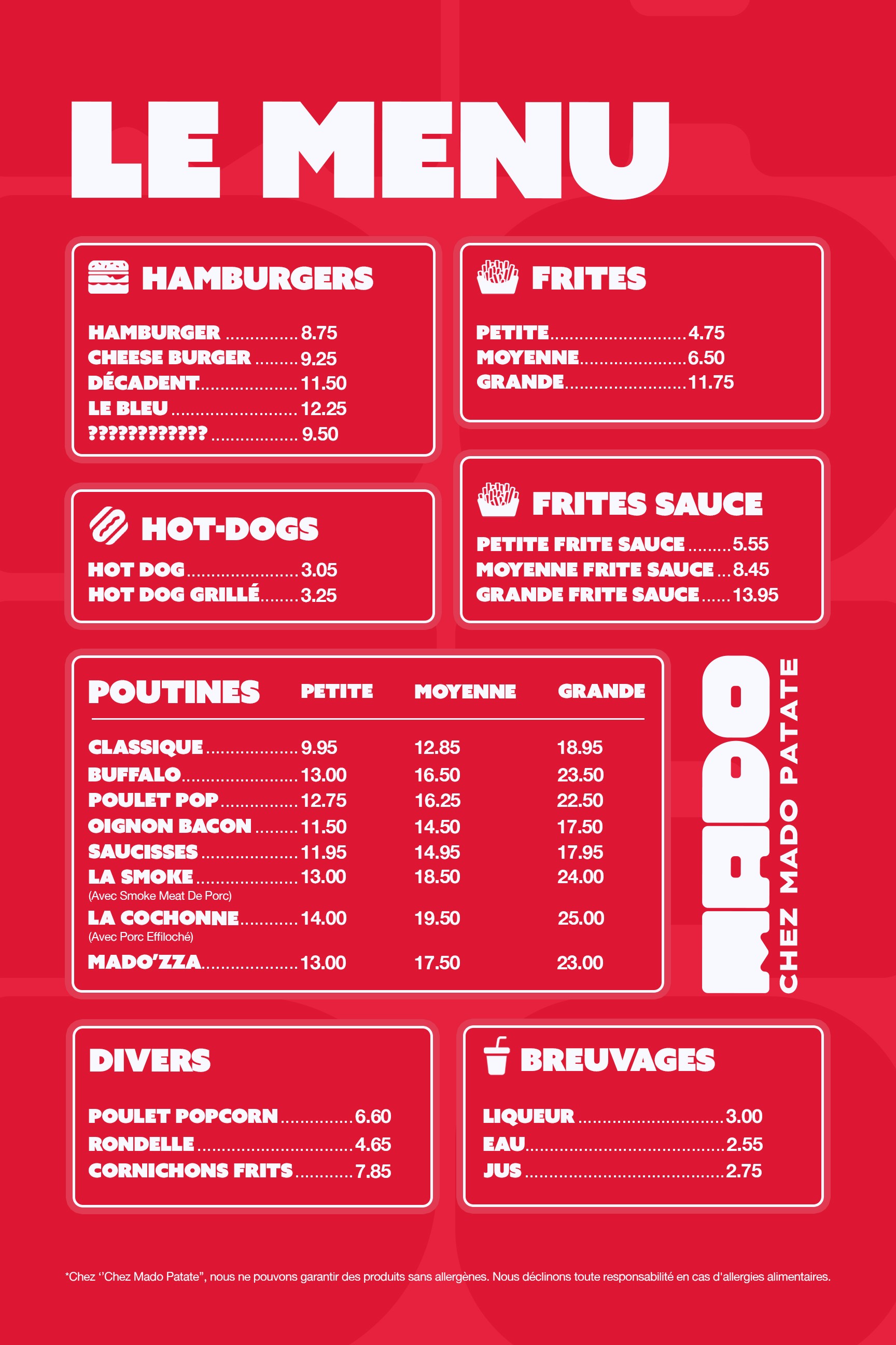 Découvre ici notre fameux menu de Chez Mado Patate. Du hamburger aux frites sauce, on en a pour tous les goûts. Chaque ingrédient est choisi à la main et on fait affaire avec des partenaires de choix. Un menu d’un vrai bon casse-croûte québécois, comme avant.